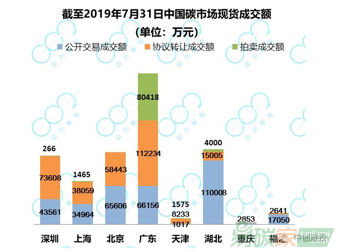 截至2019年7月31日,9個備案的交易所共成交CCER1.95億噸,其中上海成交8502萬噸,占比約44%。7月,上海、廣東、北京、深圳、湖北、