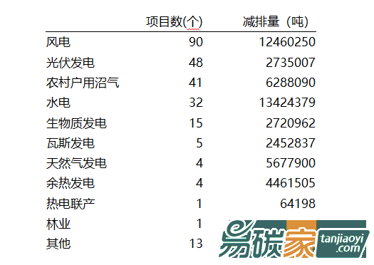 從項目類別看,已獲得減排量備案且材料公示的254個項目中,有第一類項目139個,合計備案減排量1890萬噸CO2e;第二類項目17個,備案減排量372萬噸CO2e;第三類項目98個,備案減排量3031萬噸CO2e。從項目類型看,風(fēng)電、光伏、農(nóng)村戶用沼氣、水電等項目較多,詳細(xì)情況如下圖所示: