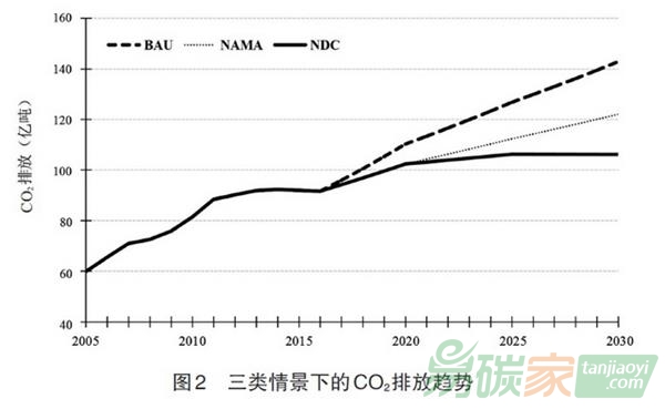 在國家適當(dāng)減緩行動(dòng)情景下,通過實(shí)施“十三五”行業(yè)規(guī)劃和控制溫室氣體排放工作方案中針對(duì)2020年的各項(xiàng)政策措施,中國有望實(shí)現(xiàn)進(jìn)一步減排,與未來二氧化碳排放的增速相比,既有政策情景將大幅降低,2020年、2025年和2030年分別將在既有政策情景的基礎(chǔ)上下降約7.9億噸、14.4億噸和20.8億噸。