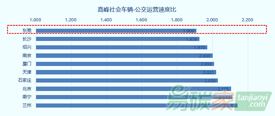 東莞高峰期公交速度與小汽車速度最接近此外,在研究范圍內(nèi)的城市中,二季度東莞市核心區(qū)內(nèi)的“高峰社會(huì)車輛-公交運(yùn)營(yíng)速度比”最小,小汽車速度是公交的1.908倍與上季度基本一致。東莞、長(zhǎng)沙、紹興3個(gè)城市的“速度比”小于2.000,這意味著,在高峰期、這些城市核心區(qū)內(nèi)的公交出行用時(shí)與小汽車的最接近。