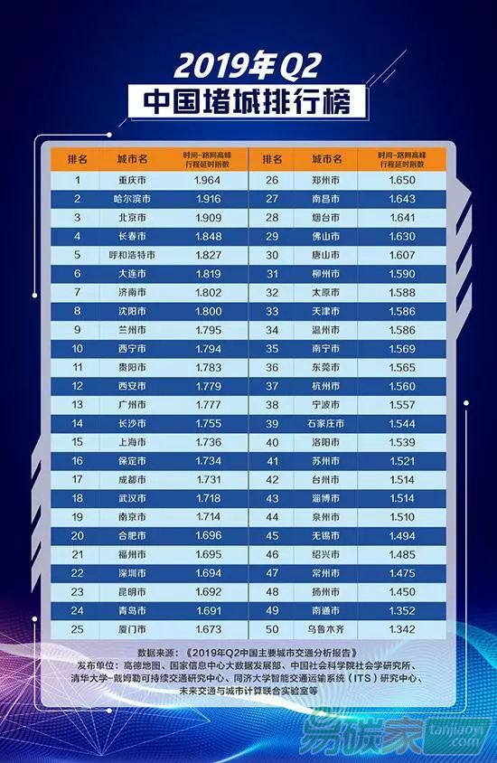 中國(guó)堵城排行榜發(fā)布 重慶再次居首根據(jù)高德地圖交通大數(shù)據(jù)監(jiān)測(cè)的50個(gè)主要城市結(jié)果顯示,2019Q2重慶路網(wǎng)高峰行程延時(shí)指數(shù)1.964,平均車速24.95km/h,高峰擁堵延時(shí)指數(shù)本季最高;本季十大堵城依次為重慶市、哈爾濱市、北京市、長(zhǎng)春市、呼和浩特市、大連市、濟(jì)南市、沈陽(yáng)市、蘭州市、西寧市,前十城市中9個(gè)位于北方。