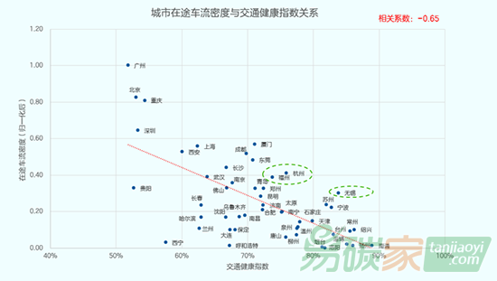 通過(guò)研究城市在途車流密度與交通健康指數(shù)的相關(guān)性發(fā)現(xiàn),在途車流密度超高的城市,交通健康指數(shù)普遍較低,例如廣州、北京、重慶、深圳,但也有個(gè)別城市存在差異,如無(wú)錫、福州、杭州雖然在途車流密度高,但交通健康指數(shù)相對(duì)較好。