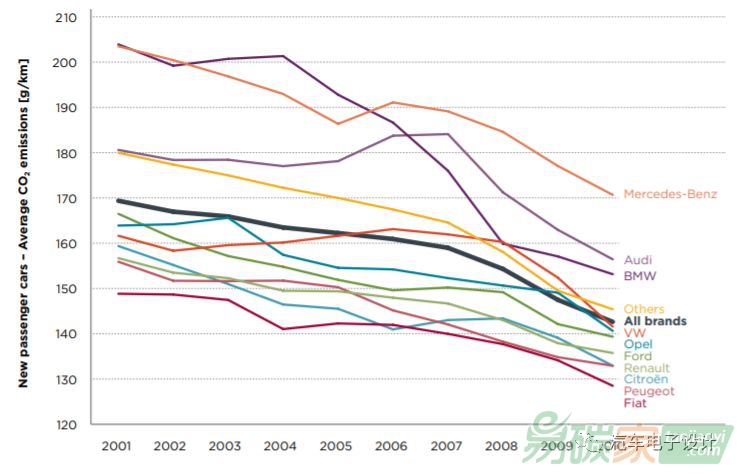 1998年歐盟第一次提出碳排放目標(biāo),計(jì)劃從1998年186g/km CO2降到2008年的140g/km CO2,2012年降至120g/km CO2。實(shí)際的情況,汽車企業(yè)當(dāng)時(shí)還沒意識(shí)到這事真的重要,執(zhí)行層面不太好,2008年歐洲乘用車CO2排放量153.5g/km CO2。