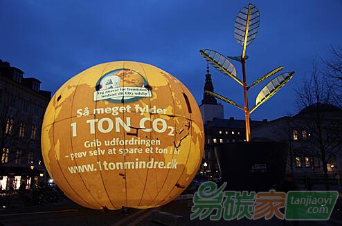 資料圖:在丹麥?zhǔn)锥几绫竟诸^放置著一個(gè)上面印有“這相當(dāng)于一噸二氧化碳排放量”的巨大氣球,警示人們不要再增加二氧化碳排放,給地球增加負(fù)擔(dān)。(新華社)