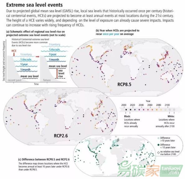 海平面上升將增加漲潮和強(qiáng)風(fēng)暴等期間產(chǎn)生的極端海平面事件的頻率。有跡象顯示,不論額外升溫幾度,到本世紀(jì)中葉,許多地區(qū)過(guò)去百年一遇的事件都將每年發(fā)生一次,許多低洼沿海城市和小島嶼將面臨風(fēng)險(xiǎn)。