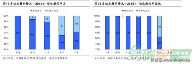 2014年共5個試點進入第一個履約期,包括上海、深圳、廣東、天津和北京,整體履約率較高。上海為唯一準時完成所有履約的試點,天津履約率最低,為95.5%。2015年全部七個試點進入履約期,進入第二年履約期的上海等試點履約率非常高,較上年亦有提升,僅深圳和天津分別出現(xiàn)2家和1家未履約企業(yè)。首次進入履約期的湖北和重慶履約率較差,且履約時間有所推遲。