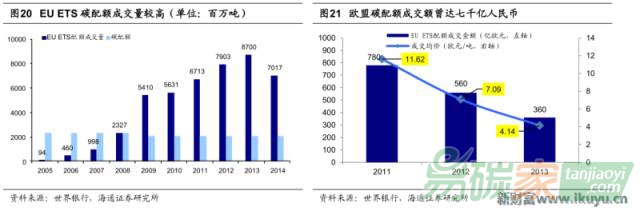 (2)未來規(guī)模:歐盟每年分配的碳配額20億噸左右,2005-2013年,歐盟配額交由易由0.94億噸攀升至87億噸,換手率由4.09%提升至417%。
