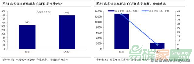 2015年CCER逐步入市交易,鑒于除北京試點外,其他試點數(shù)據(jù)公布較少,我們以北京試點為例進行分析。2015年1月至10月,北京試點碳配額成交315萬噸,CCER成交445萬噸,較配額交易更加活躍;配額成交額13065萬元,均價41.48元/噸,CCER成交445萬噸,成交額2227萬元,均價僅5元/噸。
