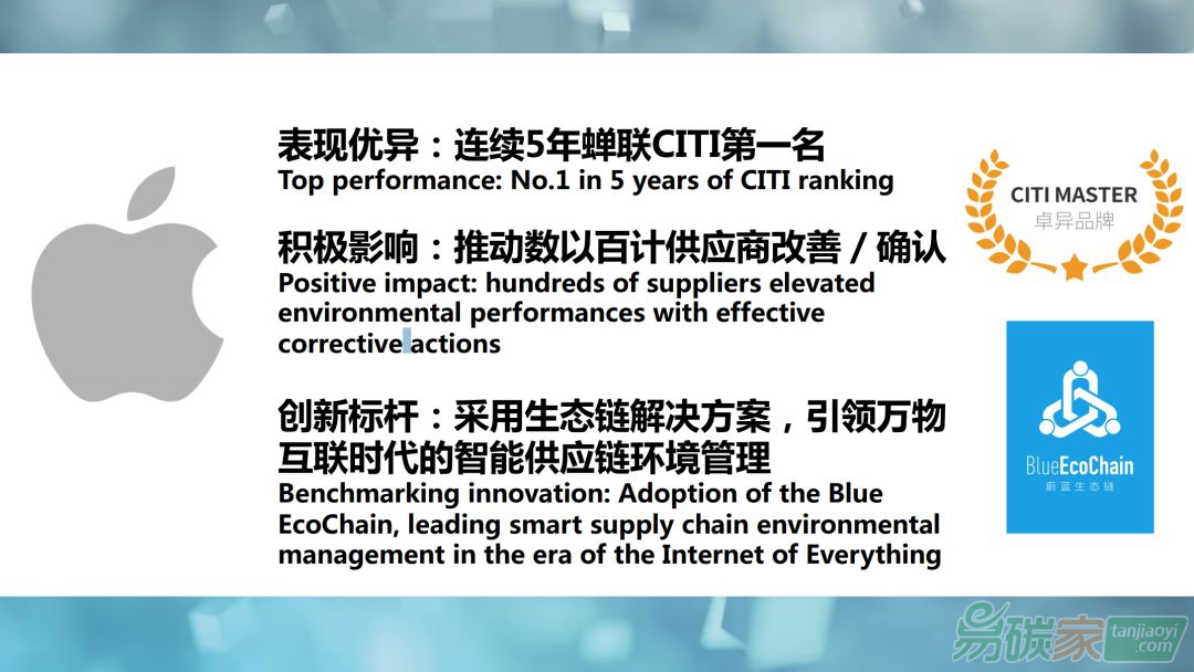 蘋(píng)果成為首個(gè)入選 “CITI卓異品牌”榜單的公司,該榜單的設(shè)立旨在推動(dòng)品牌在供應(yīng)鏈環(huán)境管理中與供應(yīng)商構(gòu)建更平等的伙伴關(guān)系,推動(dòng)供應(yīng)商更主動(dòng)地承擔(dān)污染治理的主體責(zé)任。