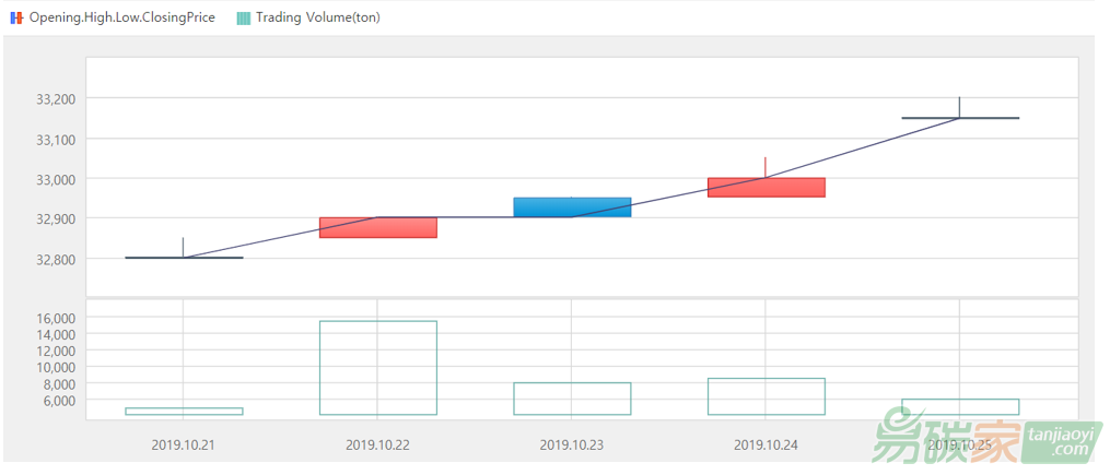 2019年10月21日至2019年10月25日,韓國(guó)碳市場(chǎng)價(jià)在32800-33200韓元/噸之間波動(dòng)(約28.0-28.3美元/噸)。