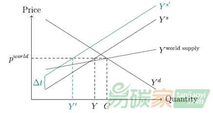 根據(新)古典貿易理論,各國會使用相對豐裕的生產要素集中生產并出口其具有“比較優(yōu)勢”的產品,各國之間通過貿易實現要素價格均等化。在實施碳價格政策的條件下,碳排放也可以被視為一種生產要素,未實施碳規(guī)制或實施低強度碳規(guī)制政策的國家具有更加豐裕的碳排放要素,因而可能生產更多的碳密集型產品,并通過國際貿易在各國間實現碳排放成本均等。作者通過下圖在(新)古典貿易理論框架下討論了上述過程。當某國征收碳稅t后,相關產品的供給曲線會上移Δt,而其新的產量變?yōu)閅′,而這種產品產量減少的部分會被進口商品的增加所替代,導致全球碳減排的總效果為零,即碳泄漏率為100%。