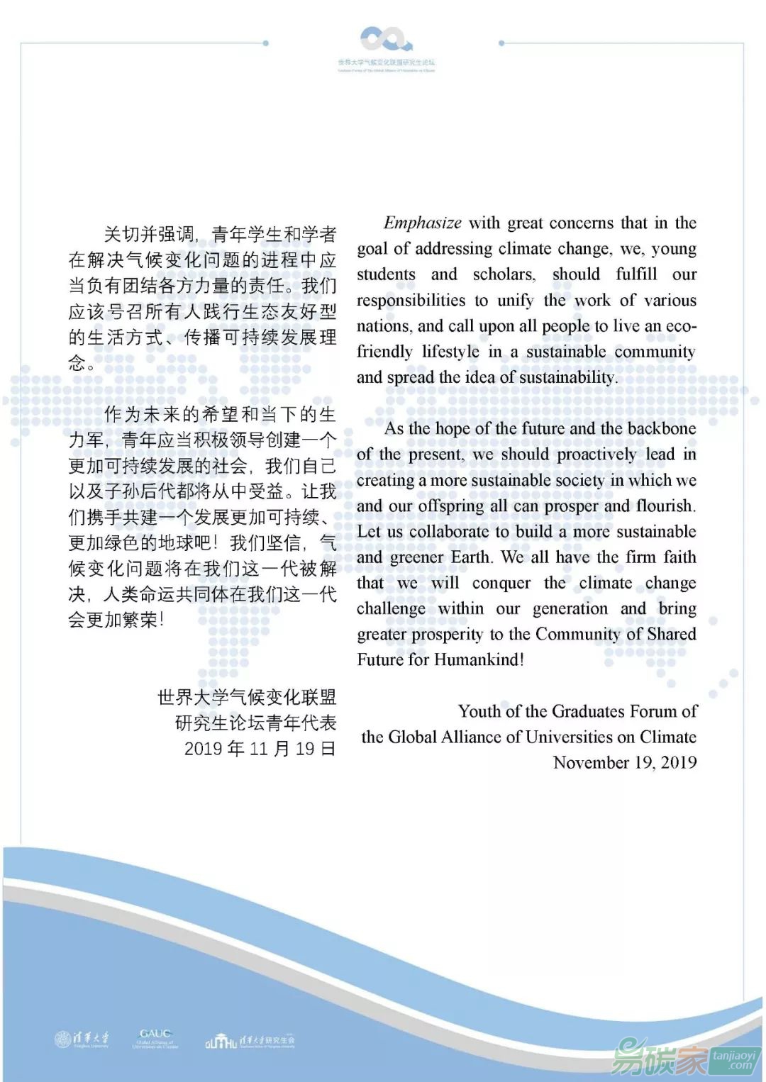 “全球氣候變化對地球母親構(gòu)成了根本威脅。青年學(xué)生和學(xué)者在應(yīng)對氣候變化的進(jìn)程中應(yīng)當(dāng)負(fù)有團(tuán)結(jié)各方力量的責(zé)任。我們號召所有人踐行生態(tài)友好型的生活方式,傳播可持續(xù)發(fā)展理念。作為未來的希望和當(dāng)下的生力軍,我們青年會積極貢獻(xiàn),創(chuàng)建一個更可持續(xù)的未來!”