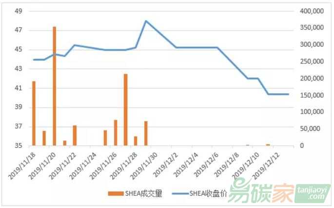 圖1 上海碳配額現(xiàn)貨價(jià)格走勢(shì)及成交量情況(2019.11.18-2019.12.13)