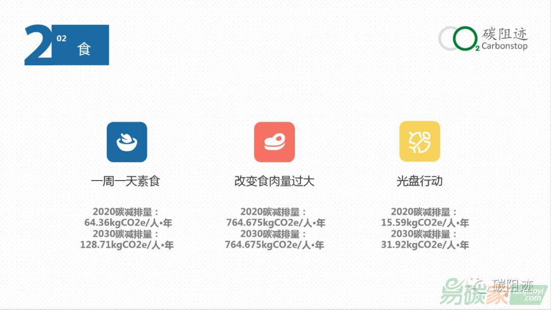 食:通過(guò)一周一天素食、改變食肉量過(guò)大以及采取光盤(pán)行動(dòng)等,2020年每人每年可實(shí)現(xiàn)碳減排超過(guò)800千克,2030年每人每年可以實(shí)現(xiàn)超過(guò)900千克碳減排。