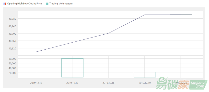 2019年12月16日至2019年12月20日,韓國碳市場價(jià)在40600-40800韓元/噸之間波動(dòng)(約35.0-35.2美元/噸)。