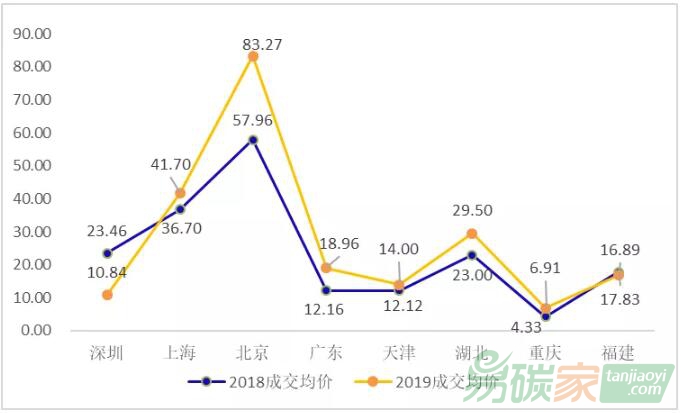 圖3.試點(diǎn)碳市場(chǎng)2018、2019年度成交均價(jià)