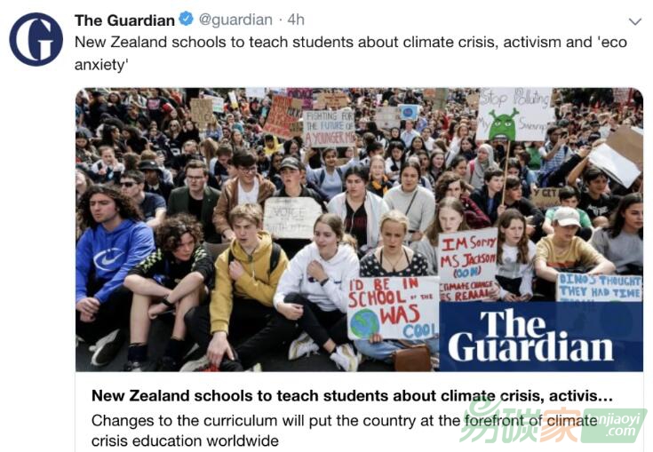 英國《衛(wèi)報》報道新西蘭推出氣候變化課程。/ 推特截圖
