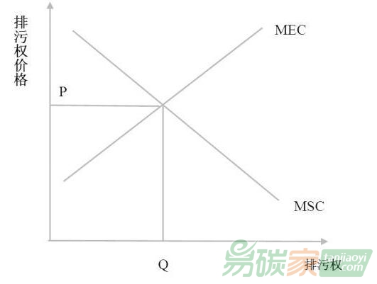 下圖中,曲線MSC代表某種污染物的邊際社會減排成本,污染物的邊際社會成本遞減,曲線向右下方傾斜。曲線MEC表示該污染物的邊際外部成本,污染物的邊際外部成本遞增,曲線向右上方傾斜。兩曲線交點(Q,P)代表社會污染物的最優(yōu)排放水平和排污權的最優(yōu)市場價格。政府控制的總量上限,或者說發(fā)放的最優(yōu)排污權配額為Q。