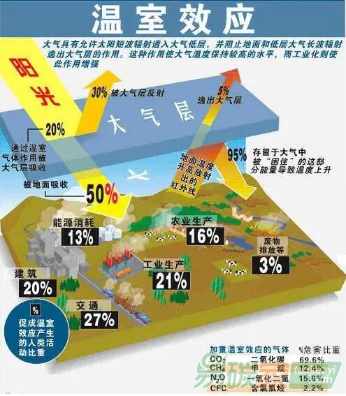 在近一個(gè)世紀(jì),造成全球氣候變暖的主要原因,是人類使用化石燃料(煤、石油等)排放出大量的二氧化碳及其它溫室效應(yīng)的氣體。溫室效應(yīng)自地球以來便是一直存在的,如果沒有溫室效應(yīng),那么地球常年都處在20℃以下。