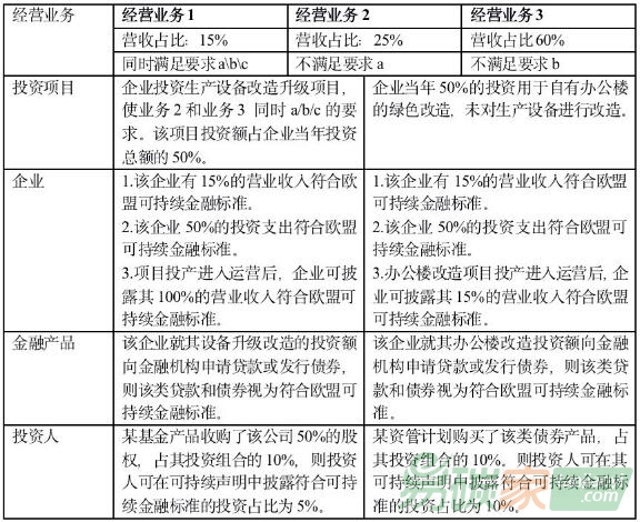方法學(xué)說明;B.投資組合對環(huán)境目標(biāo)的貢獻;C.符合可持續(xù)金融標(biāo)準(zhǔn)的投資占比。同時企業(yè)應(yīng)當(dāng)解釋其這兩個披露目標(biāo)是否達成以及如何達成。其中,經(jīng)營業(yè)務(wù)以及投資活動等是否符合標(biāo)準(zhǔn)主要參考三個指標(biāo):a.對至少一類環(huán)境目標(biāo)做出突出貢獻。b.對其它五類環(huán)境目標(biāo)沒有顯著的破壞;c.滿足基本要求。