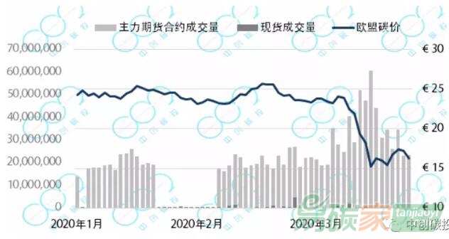 歐盟碳價(jià)在一季度的前兩個(gè)多月內(nèi)保持平穩(wěn),然而3月中旬受到疫情的強(qiáng)烈沖擊,歐盟碳價(jià)快速下跌至最低15.23歐元每噸,較年初下跌了37%。