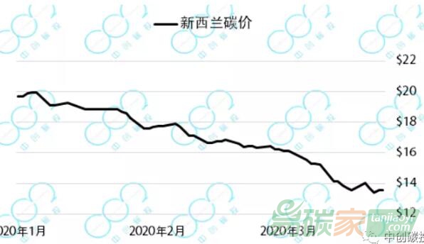 新西蘭碳價(jià)在2020年一季度一路走低,自20美元下跌至13.6美元每噸,跌幅達(dá)32%。