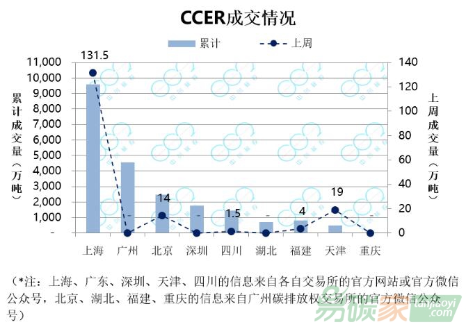四川、福建、天津市場(chǎng)發(fā)生CCER交易,共計(jì)成交169.9萬(wàn)噸,與上周(169.5萬(wàn)噸)基本持平。其中上海市場(chǎng)成交量最高,為131.5萬(wàn)噸;天津和北京市場(chǎng)次之,分別為19.1萬(wàn)噸和14.2萬(wàn)噸;四川市場(chǎng)成交量最低,為1.5萬(wàn)噸。