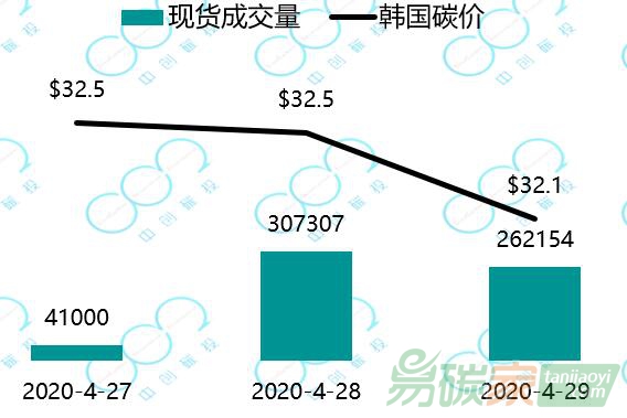 2020年4月27日至2020年4月29日,韓國碳價小幅下跌至32.1美元每噸。受疫情影響,韓國碳市場主管部門將履約期限延長了一個月至2020年7月31日。
