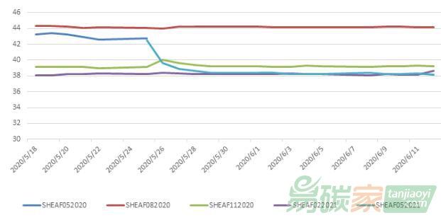 本報(bào)告期內(nèi)(2020年6月8日至2020年6月12日),上海碳配額遠(yuǎn)期中央對(duì)手清算業(yè)務(wù)保持平穩(wěn)運(yùn)行。遠(yuǎn)期市場(chǎng)價(jià)格稍有波動(dòng),遠(yuǎn)端協(xié)議與最近端的2020年8月協(xié)議維持較大價(jià)差。其中,2020年8月協(xié)議期末結(jié)算價(jià)44.14元/噸,保持上周五價(jià)格水平不變,2020年11月協(xié)議期末結(jié)算價(jià)39.23元/噸,較上周五環(huán)比下跌0.01元/噸。