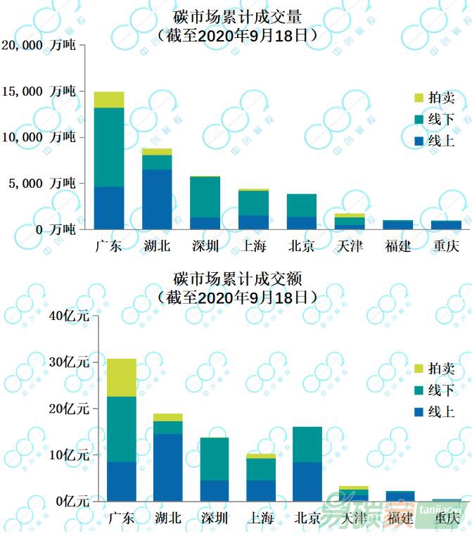 截至2020年9月18日,8個區(qū)域碳市場現(xiàn)貨累計成交4.15億噸,總成交額95.58億元。其中,廣東、湖北累計成交量與成交額最高,位于第一梯隊;深圳、北京、上海成交量與成交額均位于第二梯隊;天津、重慶、福建累計成交量與成交額位于第三梯隊。