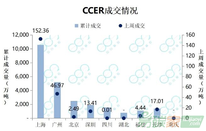 四川、天津、福建均發(fā)生CCER交易,周累計成交260萬噸,較上周小幅增加。上海CCER市場活躍,本周成交150萬余噸。