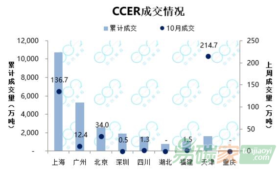 10月,CCER市場(chǎng)共計(jì)成交401萬(wàn)噸,較9月大幅下降54%。其中天津CCER成交量最高,為215萬(wàn)噸,上海其次,達(dá)136.7萬(wàn)噸;除湖北、重慶市場(chǎng)外,各區(qū)域CCER市場(chǎng)均有成交。