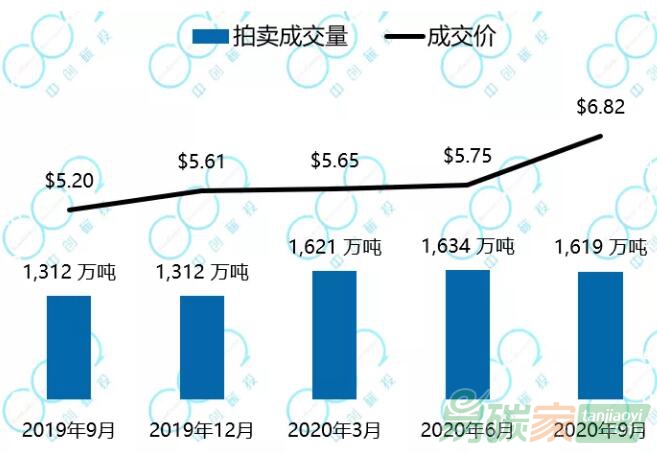 加州-魁北克碳市場(chǎng)的初始配額發(fā)放以拍賣為主,每個(gè)季度舉行一次拍賣。2020年拍賣基價(jià)設(shè)定于16.68美元,比去年提高了7%。受疫情影響,美國大量企業(yè)停工,第二季度配額拍賣成交慘淡,拍賣成交量僅為供應(yīng)量的35%。第三季度拍賣恢復(fù)了活躍,90%的拍賣量得以成交,以16.69美元每噸的均價(jià)成交了6792萬噸。第四季度拍賣計(jì)劃于11月17日舉行。