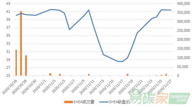 碳配額(SHEA)現(xiàn)貨線上成交18,881噸,較上周有所擴(kuò)張,協(xié)議轉(zhuǎn)讓無成交。本周SHEA現(xiàn)貨市場周二至周四較為活躍,日均成交6,292噸。價(jià)格方面,本周SHEA價(jià)格較上周大幅抬升,周一上漲至39.27元/噸,后繼續(xù)穩(wěn)步上揚(yáng),再次突破40元/噸水平,周五報(bào)收41.47元/噸,較上周五環(huán)比上漲5.77元/噸(如圖1)。