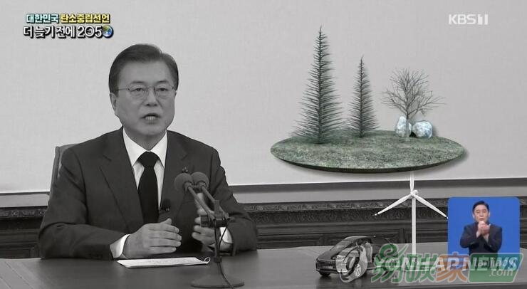 12月10日,在青瓦臺,總統(tǒng)文在寅發(fā)表“2050碳中和宣言”。相關(guān)講話內(nèi)容當天以更加環(huán)保低碳的黑白畫面在全國直播。 韓聯(lián)社/KBS電視臺截圖