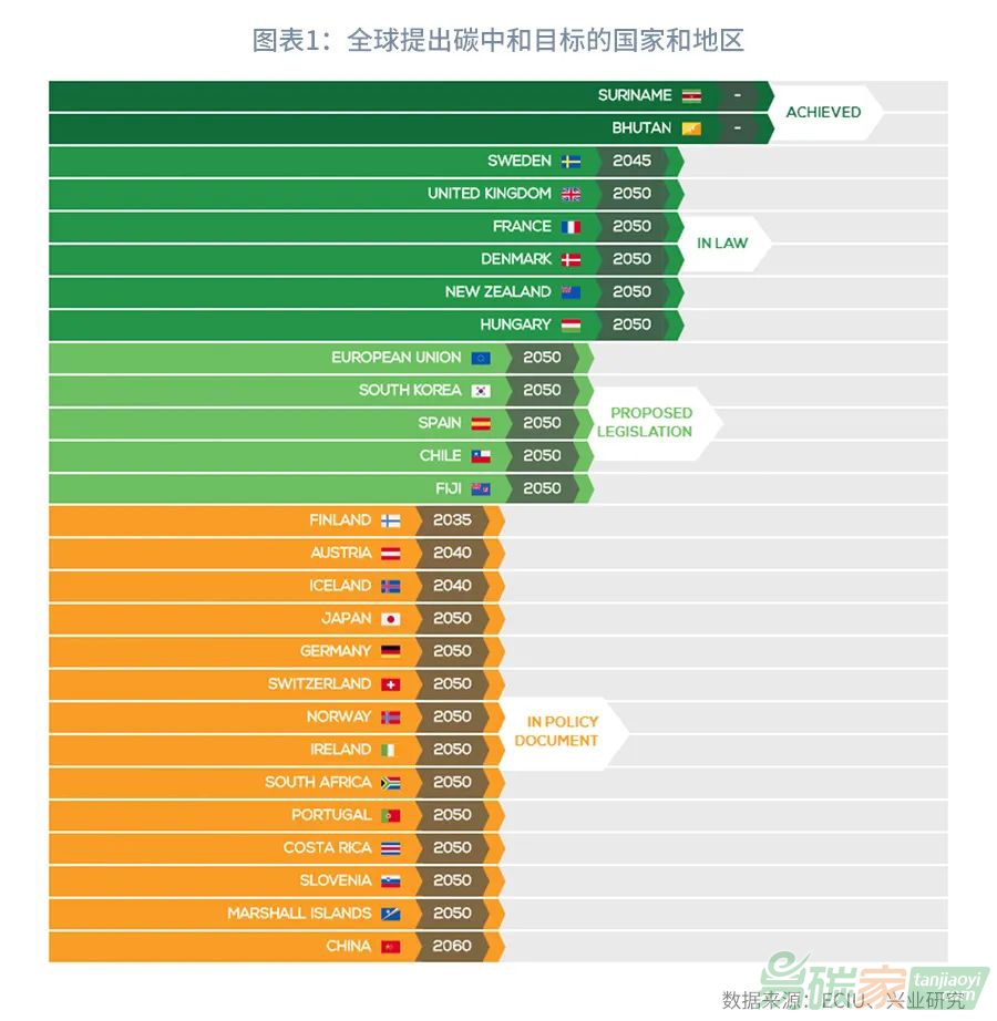 當(dāng)前,全球已有部分國家和地區(qū)率先實(shí)現(xiàn)了碳中和,部分國家和地區(qū)已將碳中和目標(biāo)寫入法律或在立法進(jìn)程中,同時(shí)也有越來越多的國家開始陸續(xù)提出碳中和目標(biāo)的時(shí)間表和路線圖,據(jù)不完全統(tǒng)計(jì),全球有120個(gè)國家和歐盟正在努力實(shí)現(xiàn)到2050年溫室氣體凈排放為零的目標(biāo)[2],隨著氣候變化問題日益嚴(yán)峻,“碳中和”已成為全球趨勢(shì)。根據(jù)能源和氣候信息小組(Energy & Climate Intelligence UNIT,ECIU)發(fā)布的全球凈零排放跟蹤表[3],目前已實(shí)現(xiàn)碳中和的國家包括不丹和蘇里南,并已實(shí)現(xiàn)負(fù)排放;已將碳中和目標(biāo)寫入法律的國家和地區(qū)包括瑞典、英國、法國、丹麥、新西蘭和匈牙利,在立法進(jìn)程中的包括歐盟、韓國、西班牙、智利和斐濟(jì),其中瑞典實(shí)現(xiàn)碳中和的目標(biāo)時(shí)間為2045年,其他國家和地區(qū)為2050年;芬蘭、奧地利等14個(gè)國家和地區(qū)已宣布碳中和目標(biāo);此外還有烏拉圭、意大利等100個(gè)國家和地區(qū)的碳中和目標(biāo)正在討論中。