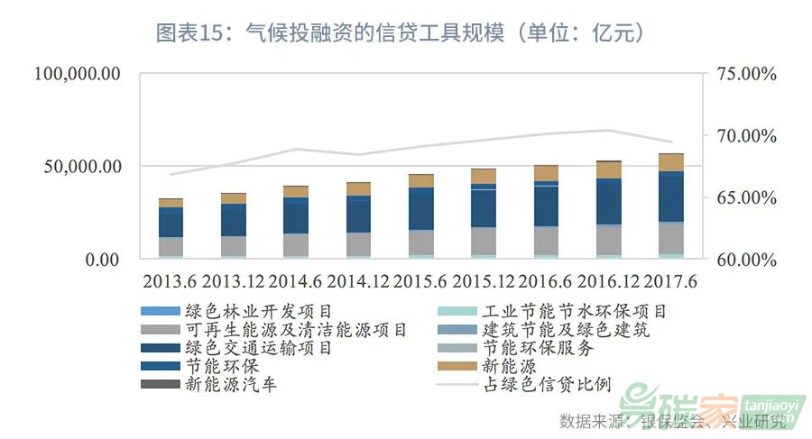 氣候融資占比呈現(xiàn)逐漸上升的趨勢(shì)。之前我國由于沒有氣候投融資的標(biāo)準(zhǔn)和統(tǒng)計(jì)制度,我們將21家主要銀行綠色信貸余額統(tǒng)計(jì)表中對(duì)二氧化碳減排具有明顯貢獻(xiàn)的綠色信貸項(xiàng)目認(rèn)定為氣候投融資支持的相關(guān)項(xiàng)目。將氣候投融資信貸工具規(guī)模定義為“對(duì)二氧化碳減排量具有明顯貢獻(xiàn)的綠色信貸項(xiàng)目+綠色信貸戰(zhàn)略新興產(chǎn)業(yè)制造端貸款”,同時(shí),篩選大項(xiàng)目下的對(duì)于二氧化碳減排量的明顯貢獻(xiàn)的細(xì)分子項(xiàng)目,從而形成各個(gè)大項(xiàng)目的不同權(quán)重。根據(jù)此測(cè)算方法,2013年6月至2017年6月,氣候投融資信貸工具余額占綠色信貸余額的比例持續(xù)增加,大約從66%增加至70%左右。其中2017年6月氣候投融資信貸余額為5.7萬億元,占全部綠色信貸余額的69.5%,假設(shè)2019年氣候投融資信貸工具規(guī)模占綠色信貸余額的比例保持在70%,預(yù)計(jì)2019年氣候投融資信貸余額將超過7萬億元。從投放領(lǐng)域來看,氣候投融資的信貸余額主要投向綠色交通運(yùn)輸項(xiàng)目、可再生能源及清潔能源項(xiàng)目、新能源制造端、工業(yè)節(jié)能節(jié)水環(huán)保項(xiàng)目。