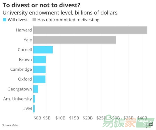 著名的學校如英國的牛津、劍橋大學,美國的喬治敦、布朗、康奈爾大學,加入了越來越多的大學和大學計劃剝離給他們捐贈的化石燃料公司。美國最富有的兩所大學,哈佛大學和耶魯大學的壓力越來越大,這兩所大學的捐贈總額達到720億美元。盡管這兩所學校都沒有承諾撤資,但哈佛大學宣布了一項仍然模糊的計劃,即到2050年將來自化石燃料公司的捐贈額降至零,并聲稱它將能夠與化石燃料公司合作實現(xiàn)這一目標。