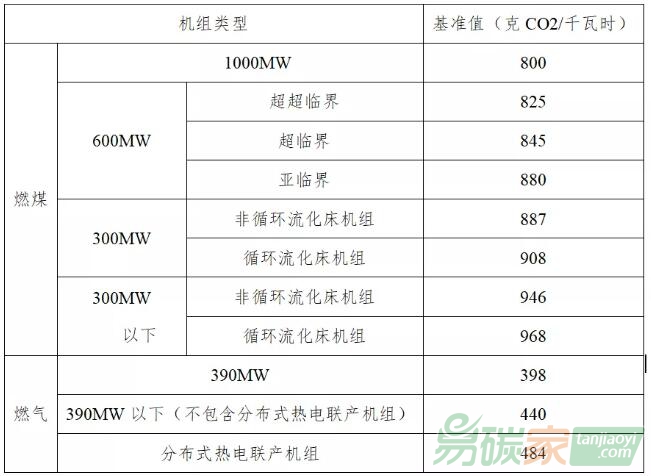 電力行業(yè)燃煤燃?xì)獍l(fā)電機(jī)組(含熱電聯(lián)產(chǎn)機(jī)組)使用基準(zhǔn)線法分配配額,對單位產(chǎn)品的二氧化碳排放量設(shè)置標(biāo)準(zhǔn)。計算公式為:控排企業(yè)碳排放配額=產(chǎn)量×基準(zhǔn)值(見表1);新建項目企業(yè)碳排放配額=設(shè)計產(chǎn)能×基準(zhǔn)值(見表1)。特殊燃料發(fā)電機(jī)組(如煤矸石、油頁巖、水煤漿、石油焦等燃料)以及供熱鍋爐采用歷史強(qiáng)度下降法分配配額,即要求排放單位年度碳排放強(qiáng)度與自身的歷史碳排放強(qiáng)度相比有所下降。