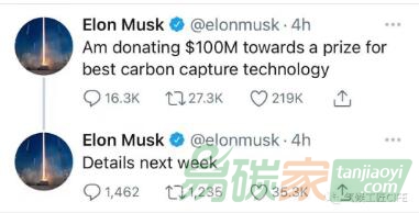 1月22日,特斯拉CEO埃隆·馬斯克(Elon Musk)發(fā)表推文,將“懸賞”1億美元用于支持最佳碳捕集技術(shù),并稱將于下周披露更多細(xì)節(jié)[1](圖1)。