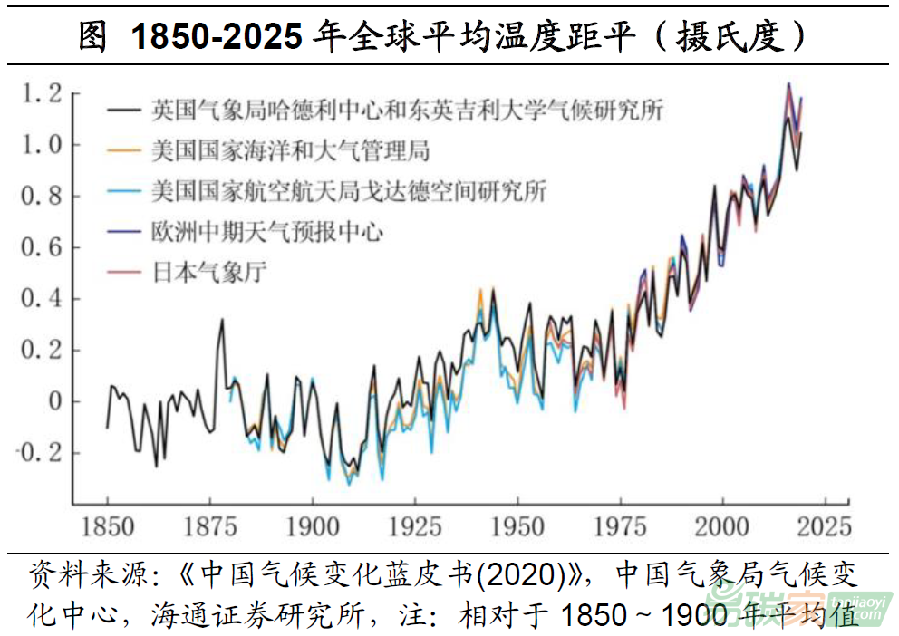 碳排放強(qiáng)度不減,氣候變暖威脅襲來。進(jìn)入工業(yè)化時(shí)代,全球二氧化碳(CO2)的排放強(qiáng)度急劇提升。2019年全球CO2排放量達(dá)到341.7億噸,是1965年的3.1倍,尤其是2000年以來增速明顯提升。隨著CO2濃度的短期劇增,全球氣溫快速升高。而一旦氣候加速變暖,風(fēng)暴、熱浪等極端天氣頻繁襲來,不僅危及人類生活,也會(huì)造成較大規(guī)模的經(jīng)濟(jì)損失。