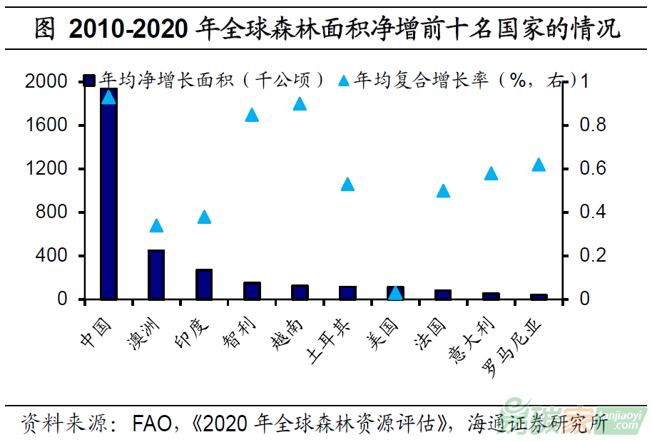 如何增強生態(tài)碳匯強度?關(guān)鍵在于提升國土綠化面積。近年來,中國的綠化取得了顯著的進展。從全球范圍看,10年至20年中國森林面積年均凈增193.7萬公頃,位居全球首位,是緊隨其后的澳洲和印度的4.3倍和7.3倍。而從增速看,中國也以0.93%的年均復(fù)合增長率遙遙領(lǐng)先。