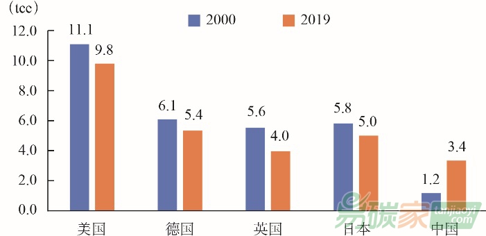 圖2?2000年與2019年中國和典型發(fā)達(dá)國家人均能源消費(fèi)量