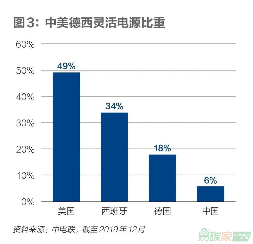 中電聯(lián)2019年12月發(fā)布的《煤電機組靈活性運行政策研究》顯示,歐美國家的靈活電源比重普遍較高,西班牙、德國、美國占比分別為34%、18%、49%,而中國占比不到6%。在中國新能源資源富集的三北地區(qū),風(fēng)電、太陽能發(fā)電裝機分別占全國的72%、61%,但靈活調(diào)節(jié)電源還不足3%。