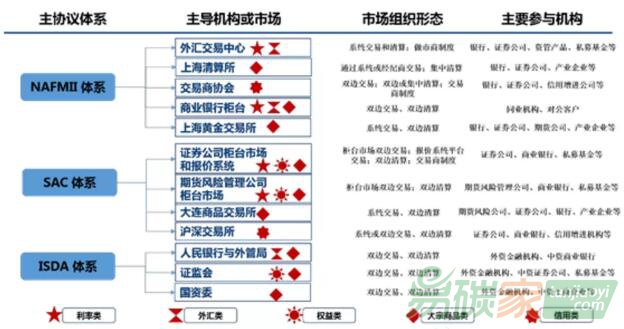國內(nèi)場外衍生品市場經(jīng)過十幾年的發(fā)展,已經(jīng)形成了一定規(guī)模和影響力,與場內(nèi)市場形成互補,在滿足投資者風(fēng)險管理、財富管理、豐富市場寬度和深度方面發(fā)揮了重要作用。與國外自下而上的發(fā)展模式不同,國內(nèi)場外衍生品市場的發(fā)展是由監(jiān)管機構(gòu)自上而下進行主導(dǎo)。不同監(jiān)管體系下的子市場相互獨立發(fā)展且采用不同的主協(xié)議體系,因此形成了 NAFMII 體系下的銀行間場外衍生品市場、SAC體系下的證 券期貨場外衍生品市場以及 ISDA體系下的外資機構(gòu)柜臺市場三大市 場體系三足鼎立的市場格局。由于每個子市場由不同的監(jiān)管機構(gòu)主導(dǎo),因此在監(jiān)管標(biāo)準(zhǔn)、產(chǎn)品種類、組織形式、主要參與機構(gòu)以及投資者門檻等方面并不統(tǒng)一,市場碎片化的