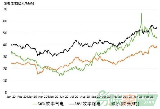 碳價(jià)每噸上升1歐元,那么每MWh煤電需要支付的碳成本就會(huì)增加0.8歐元,氣電則會(huì)上升約0.4歐元。圖5顯示了近一年來德國(guó)中等效率的煤電和氣電的邊際發(fā)電成本的變化??梢悦黠@看出碳價(jià)和煤電邊際成本的波動(dòng)關(guān)系更緊密。根據(jù)目前的燃料價(jià)格,煤電成本約為54歐元/MWh,根據(jù)碳價(jià)為38歐元的水平,那么煤電所含的碳成本約30歐元,氣電成本略低在45歐元/MWh,含碳價(jià)成本15歐元。如果剔除碳價(jià),那么煤電和氣電的發(fā)電成本則分別為 24歐元和30歐元,氣電反而更高,這顯示了碳價(jià)提高氣電成本優(yōu)勢(shì)的作用機(jī)理。