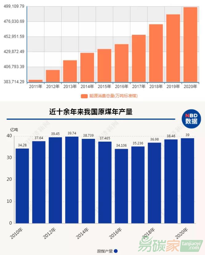 | 從上述兩圖對(duì)比可以看出,盡管近年中國(guó)經(jīng)濟(jì)仍保持較快增長(zhǎng),能源消費(fèi)總量不斷提升,但原煤產(chǎn)量較高峰已有回落,原煤占能源消費(fèi)結(jié)構(gòu)比重也逐步降低