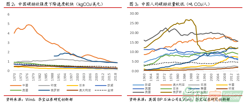 由于發(fā)展階段的不同,發(fā)達(dá)國家基本均已經(jīng)歷碳達(dá)峰,中國碳排放仍在“爬坡”,但人均碳排放較低。中國在1950年的碳排放總量僅有2146.5萬噸,在1950年至2013年60年期間中國的碳排放總量增長超過100倍,同期增長速率遠(yuǎn)高于世界其他主要經(jīng)濟(jì)體。據(jù)2015年哈佛中國碳排放報(bào)告,2007年中國二氧化碳排放總量超過美國躍居全球第一,至2012年中國碳排放總量已經(jīng)相當(dāng)于美國和歐洲排放量的加總。在中國30余年強(qiáng)勁經(jīng)濟(jì)增長的推動(dòng)下,碳排放快速增長,進(jìn)入21世紀(jì)后中國的碳排放在十余年時(shí)間內(nèi)增長了3倍。在2010年至2012年間,全球有73%的碳排放增長源于中國。從碳排放強(qiáng)度的指標(biāo)來評價(jià)國家碳排放水平,發(fā)達(dá)國家一直處于較低水平,且一直呈現(xiàn)降低趨勢。而中國碳強(qiáng)度近30年來,處于下降趨勢,且下降速度較快,當(dāng)前已于印度、俄羅斯持平。人均碳排放也是被廣泛使用的衡量國家碳排放水平的重要指標(biāo),中國是目前世界上人口最多的國家和第二大經(jīng)濟(jì)體,盡管中國的碳排放總量已居于世界第一,但是中國的人均碳排放量仍然遠(yuǎn)低于世界上主要的發(fā)達(dá)國家。2013年中國的人均碳排放量為2.05噸碳,不到美國人均碳排放量(4.4噸碳)的二分之一。