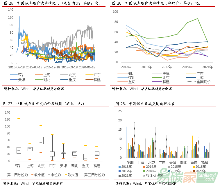 從碳價(jià)波動(dòng)情況上看,湖北、天津碳價(jià)相對穩(wěn)定,北京、深圳、廣東波動(dòng)幅度較大。深圳、廣東碳試點(diǎn)在剛開始運(yùn)營時(shí),碳價(jià)波動(dòng)均非常劇烈,深圳2013及2014年、廣東2014年碳價(jià)標(biāo)準(zhǔn)差均超過16,隨后幾年有所降低;北京碳試點(diǎn)在2018-2021年碳價(jià)波動(dòng)有所加劇。