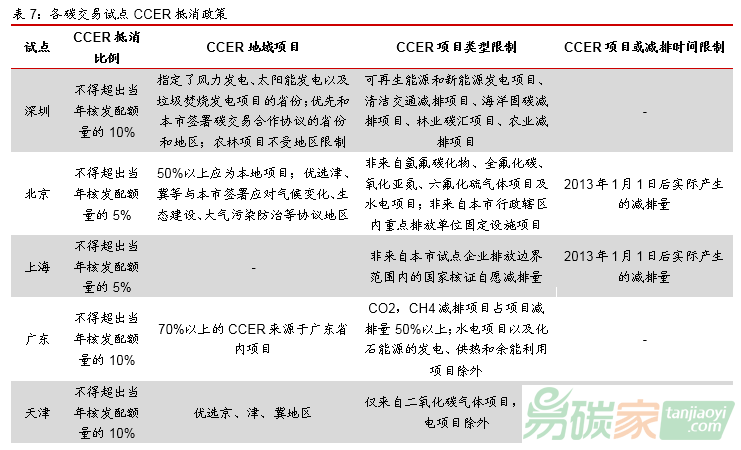 各試點(diǎn)實(shí)行不同抵消機(jī)制,抵消比例5%-10%之間。各試點(diǎn)均以CCER作為碳排放抵消指標(biāo),但抵消比例不同。北京、上海試點(diǎn)CCER抵消使用比例不得超過當(dāng)年核發(fā)配額量的5%;天津試點(diǎn)抵消使用比例不超過當(dāng)年實(shí)際排放量的10%;深圳、湖北試點(diǎn)抵消使用比例不超過配額量的10%;廣東的CCER抵消使用比例不超過企業(yè)上年度實(shí)際排放量的10%;重慶抵消使用比例不超過審定排放量的8%。
